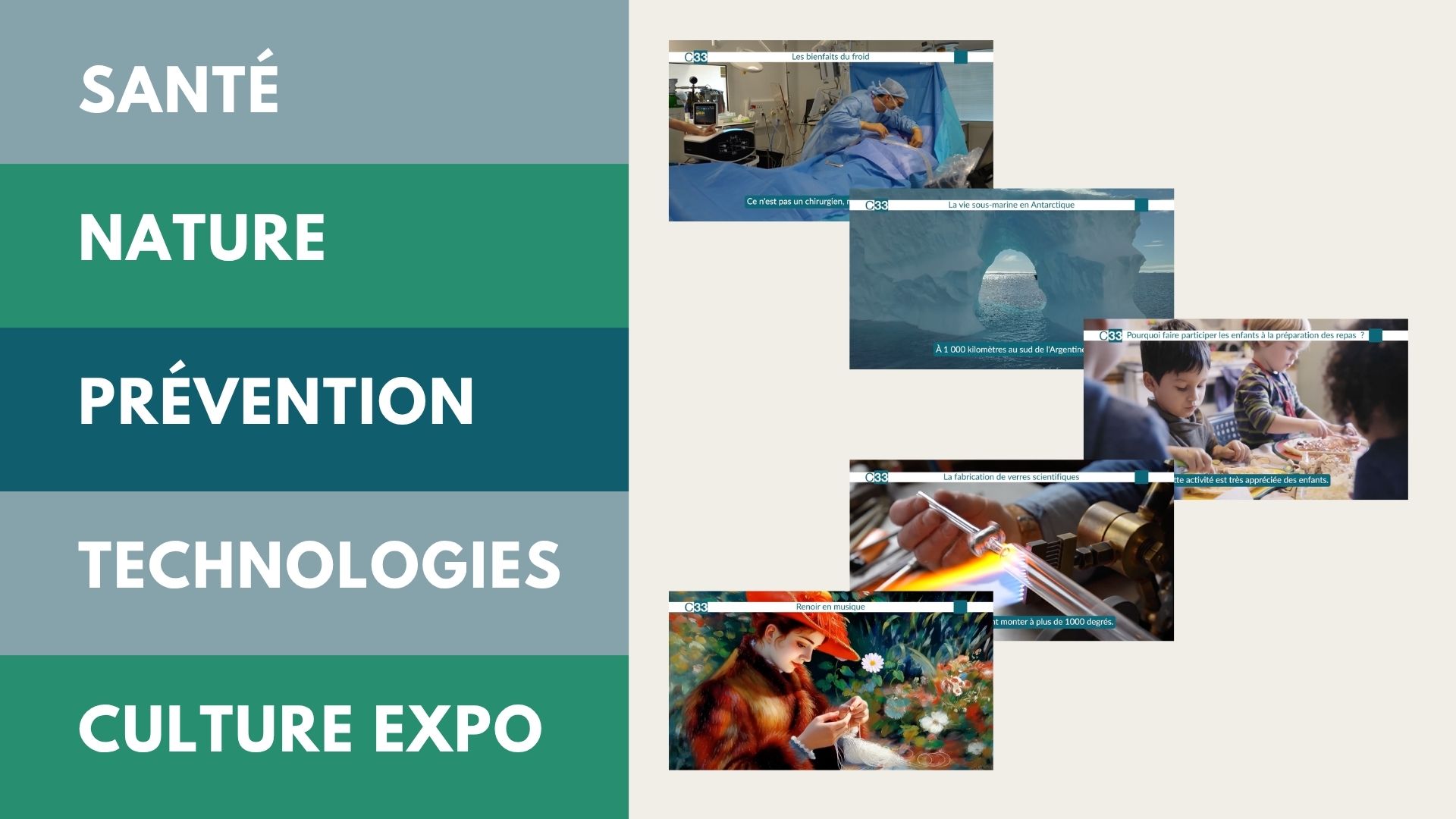 L’écran à affichage digital, en plus de rendre parfaitement visibles vos informations de cabinet (horaires, fermetures exceptionnelles, remplaçants, nouveaux services, etc.), il diffuse des contenus vidéos aussi variés que qualitatifs avec des séries de documentaires sur de nombreux thèmes :